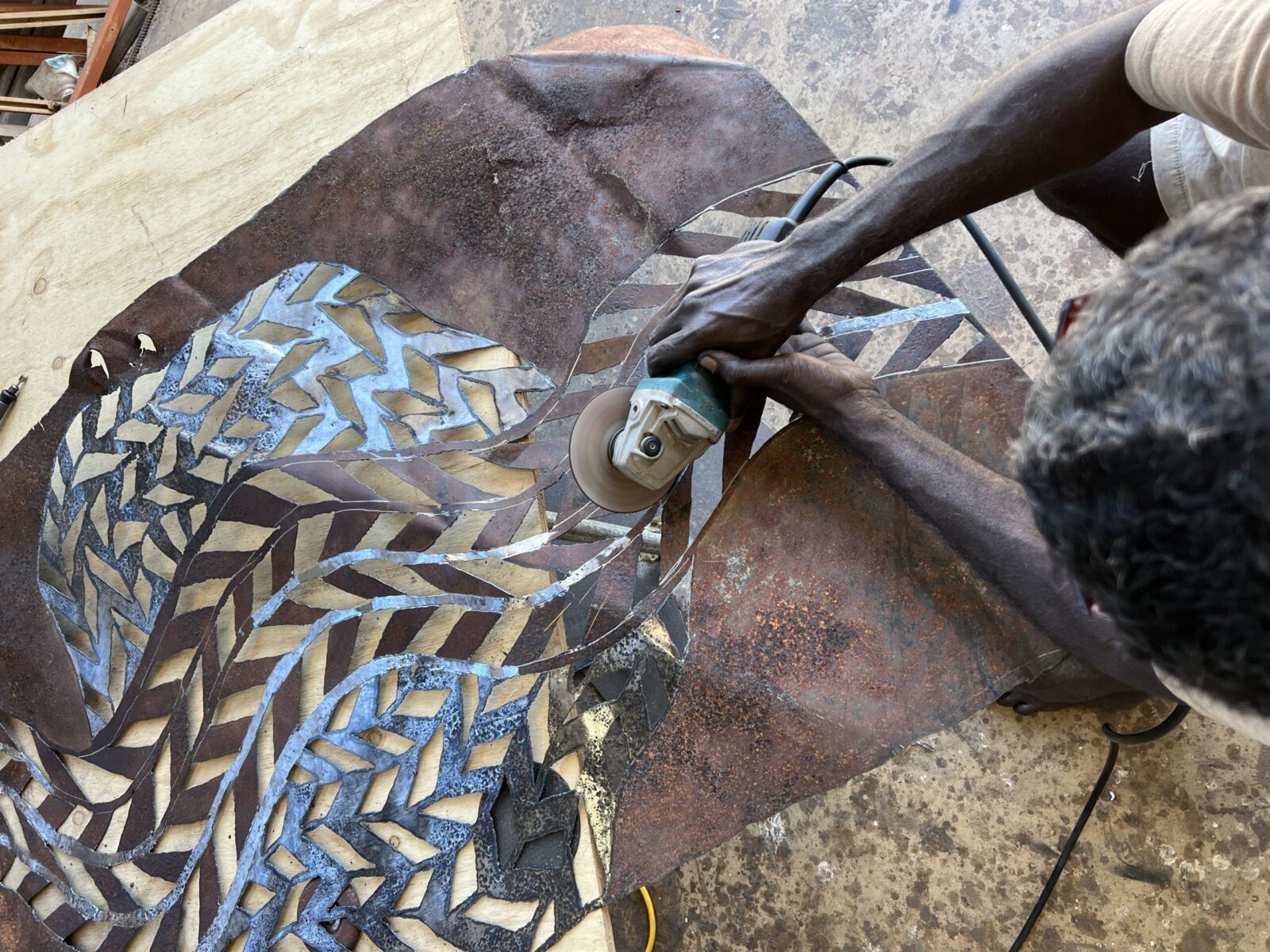 At the art centre, however, we found his myriad projects, all in various stages of completion, a valuable insight into the mind of this great artist. David Wickens, Buku’s coordinator, generously toured us through the stall of ideas and mediums – masterfully painted barks alongside unexpected materials such as rubber, foil insulation and various sheets of metal: twisted, rusted, etched, welded, hammered, bent and buffered.
