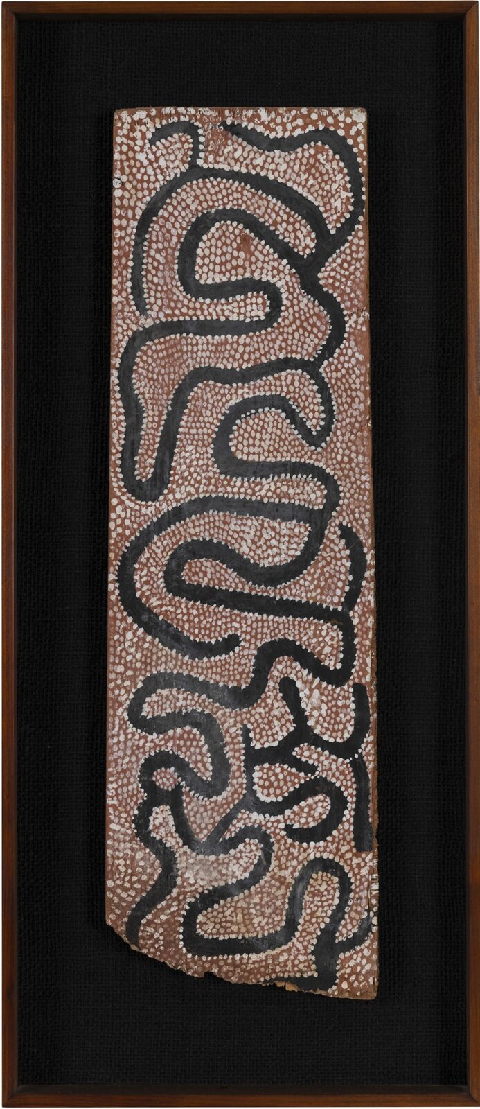 Water Dreaming and Lightning 1971 is one the first works Warangula is known to have created, in which he has ingeniously transferred designs typically painted onto backs and torsos during ceremonies onto a similarly shaped board.